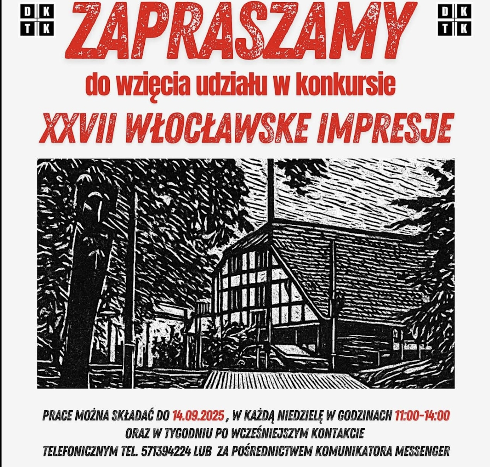 Prace można zgłaszać 14 września 2025 r. Wernisaż wystawy: 11 października 2025 r. (sobota) o godz. 18:00 w siedziba Dobrzyńsko-Kujawskiego Towarzystwa Kulturalnego – Czarny Spichrz, Włocławek Piwna 4